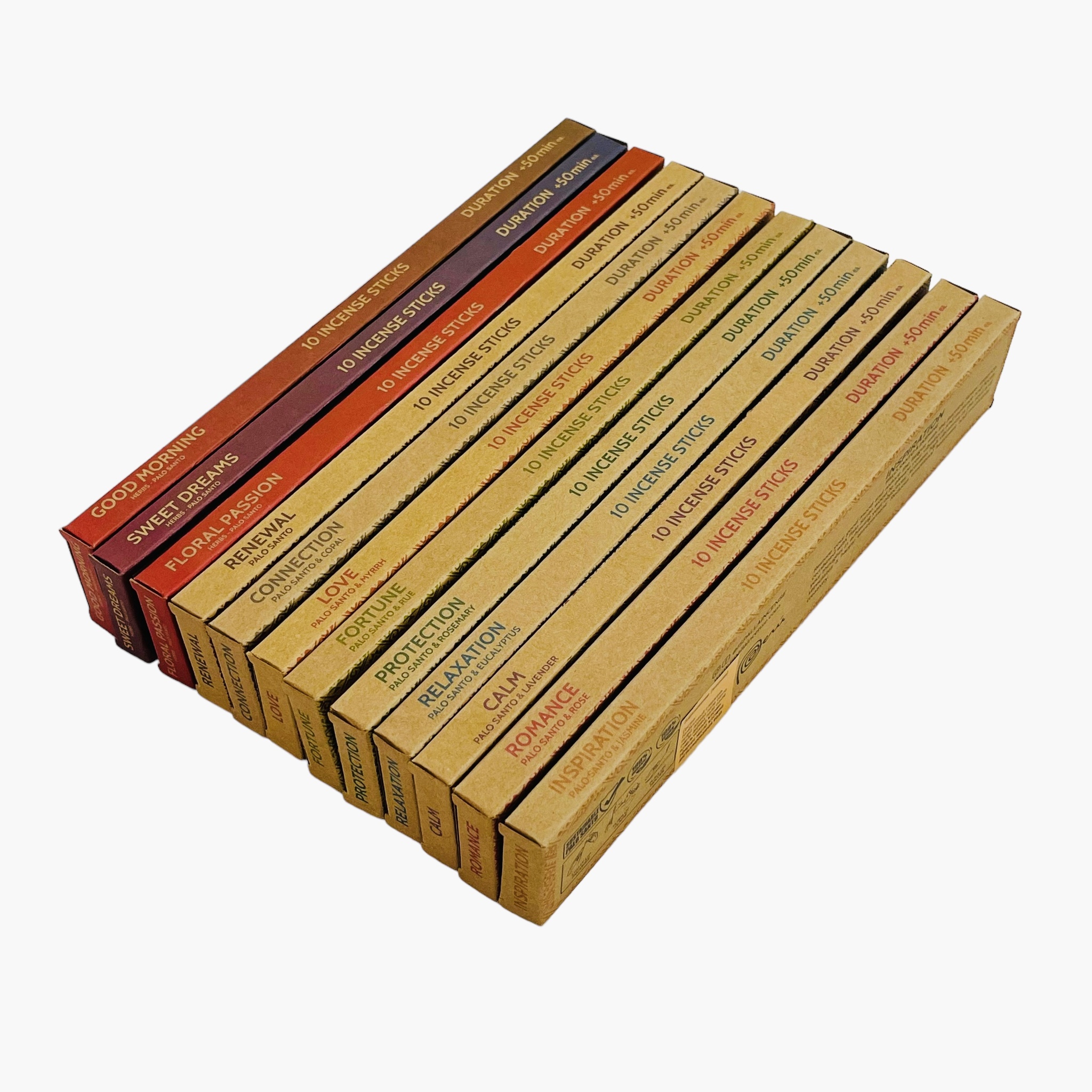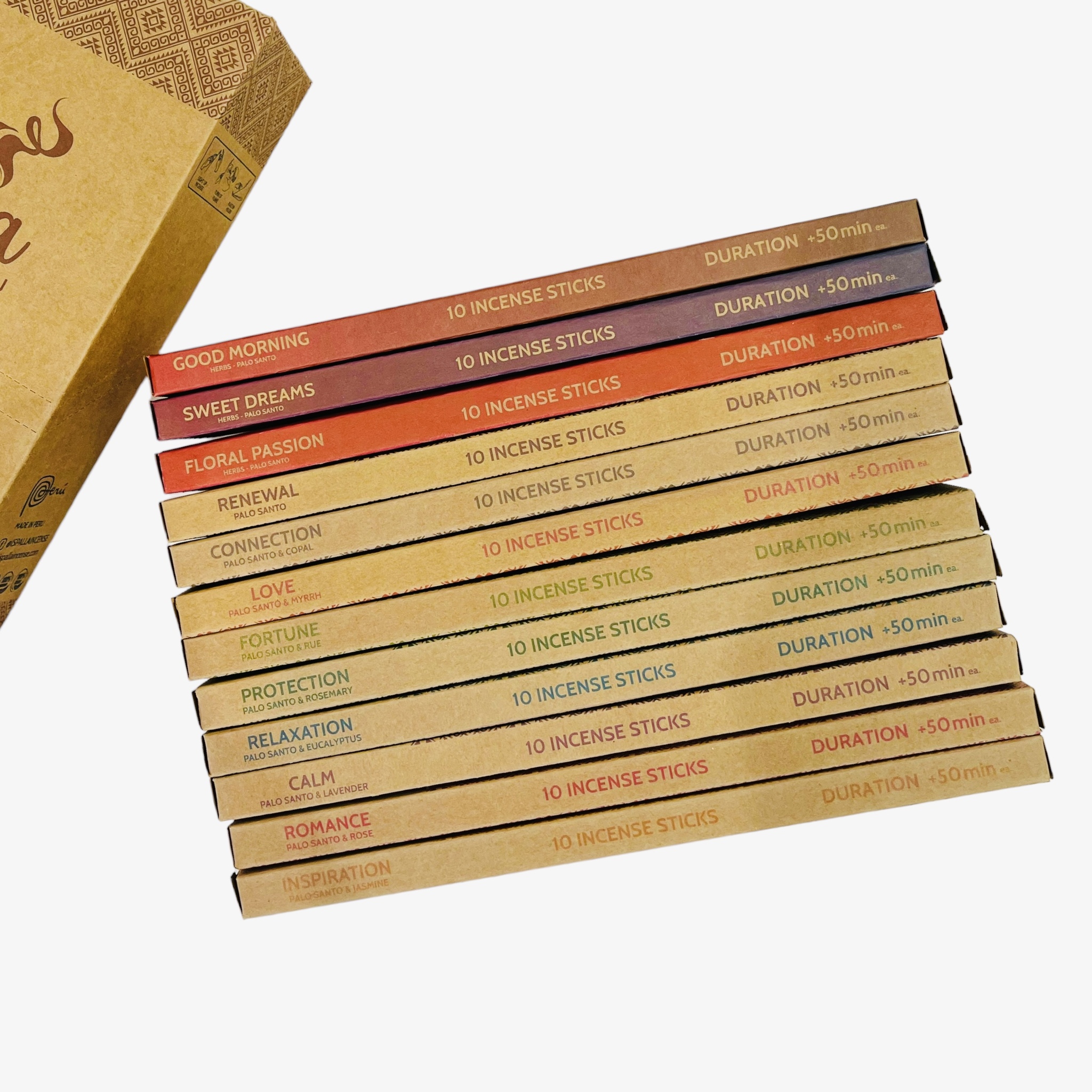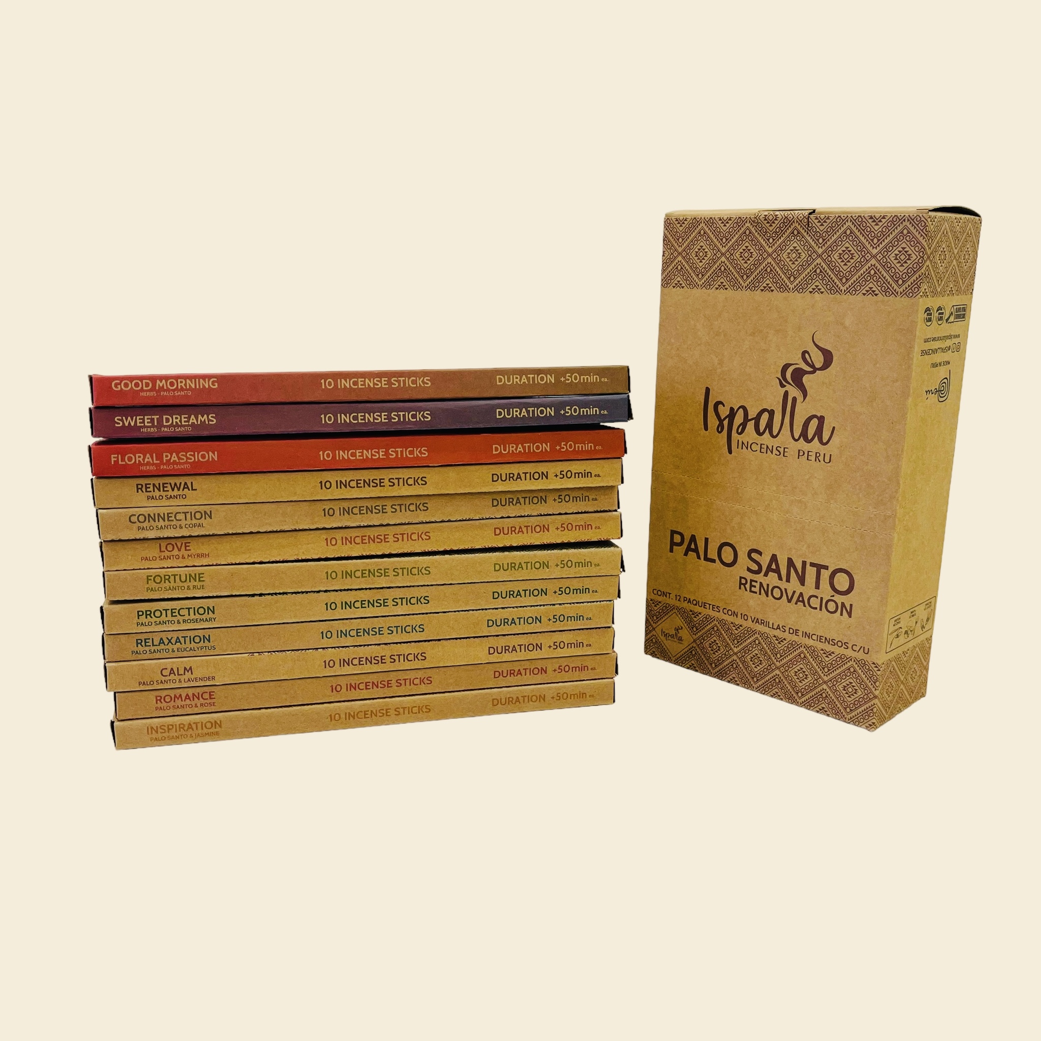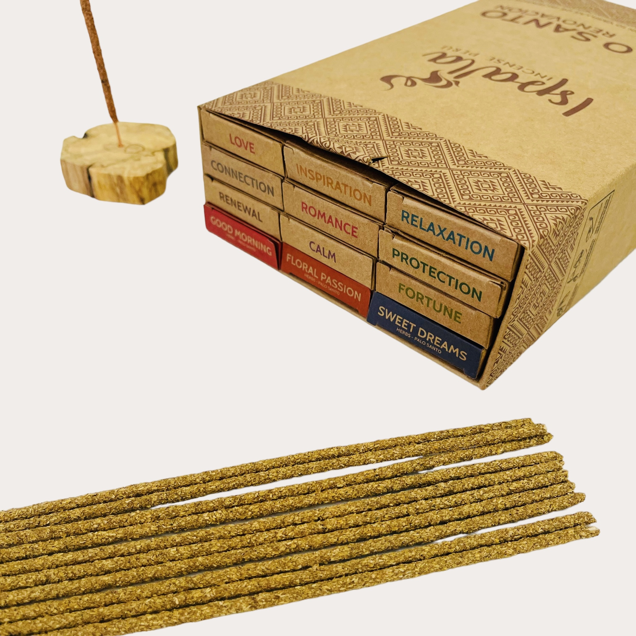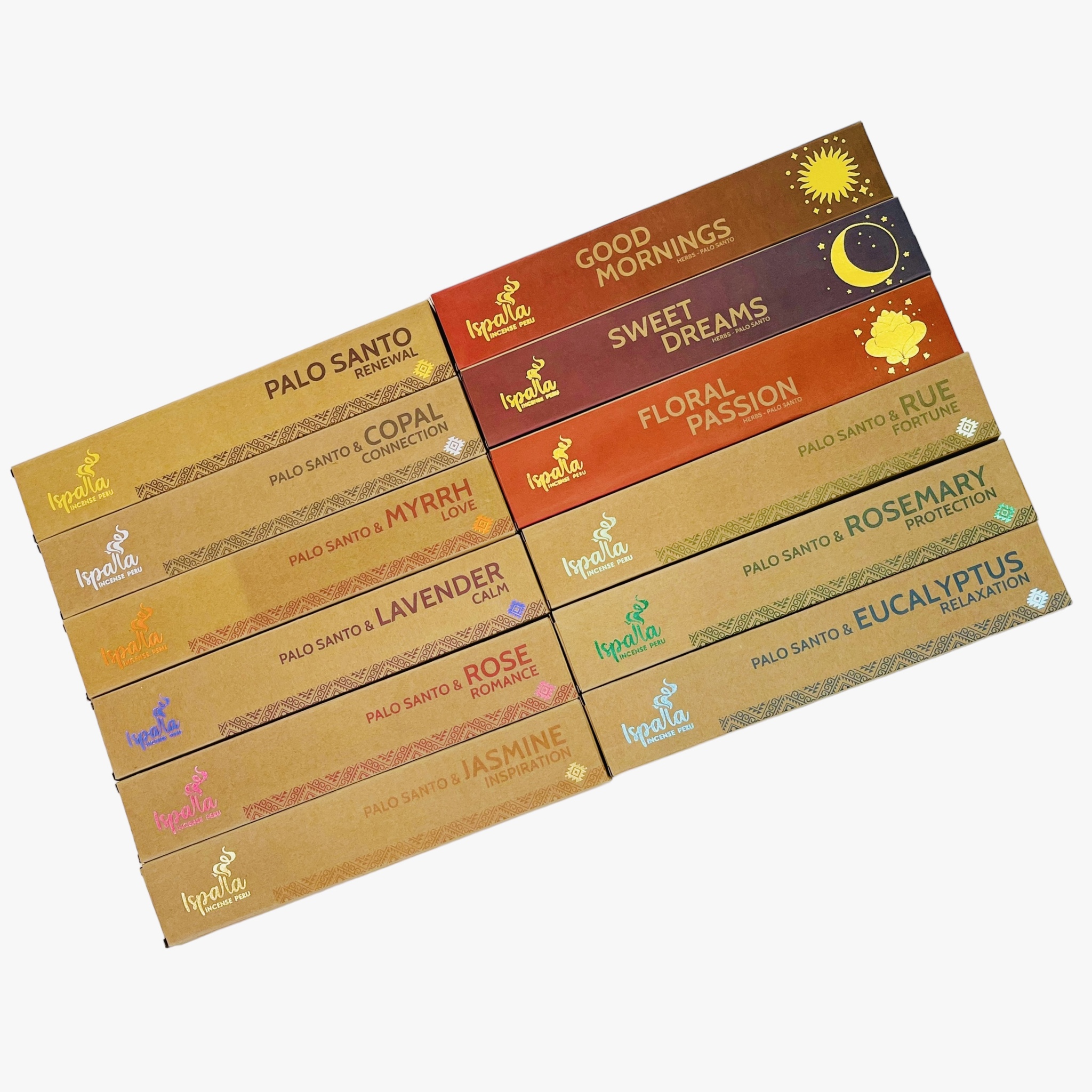 12 упаковок с разными ароматами Ispalla Incense Peru c большой скидкой. По 10 благовоний в каждой упаковке.